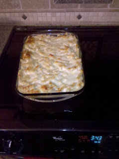 6. Spread the mixed ingredients evenly over the layer of pasta in the 9 x13" baking dish.